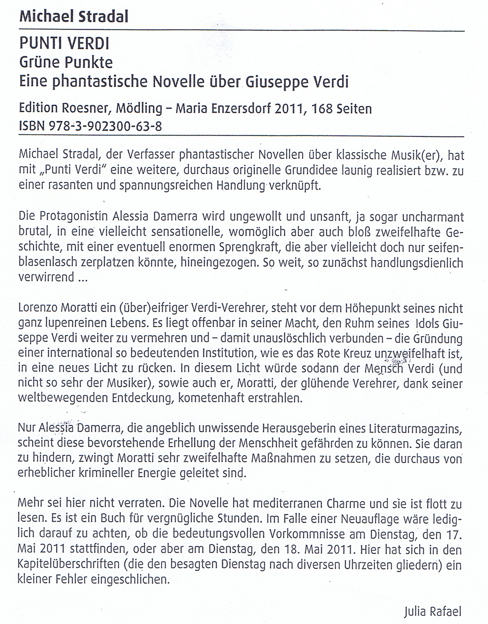 Michael Stradals phantastische (Musiker-)novellen haben es an sich, dass man nach der Lektüre nicht ganz sicher sein kann, was der historischen Wahrheit gerecht wird und was erfunden ist, denn Unwahrscheinliches und Historie sind zu eng umschlungen. Im Fall ‚Punti Verdi' hingegen muss man sich – will man es ganz genau wissen – möglicherweise bis zum 10. Oktober 2013, Verdis 200. Geburtstag, gedulden.