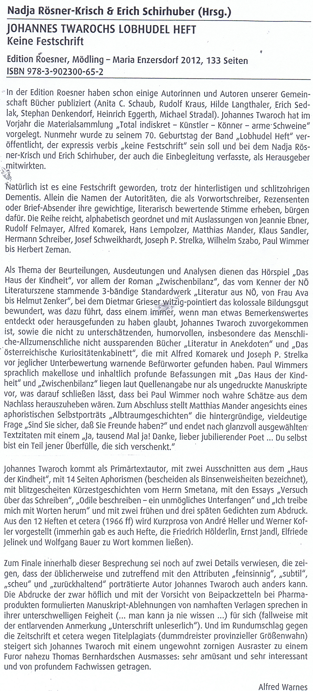 Johannes Twaroch war viele Jahrzehnte als Hörfunkredakteur eine wesentliche Anlaufstelle für Autorinnen und Autoren. Anlässlich seines siebzigsten Geburtstages zeigt ein Blick auf sein eigenes literarisches Werk wiederum, dass er selber als ein Schriftsteller von Rang genannt werden muss: ein senibler Erzähler, ein schlitzohriger Aphoristiker, ein humorvoller Essayist.